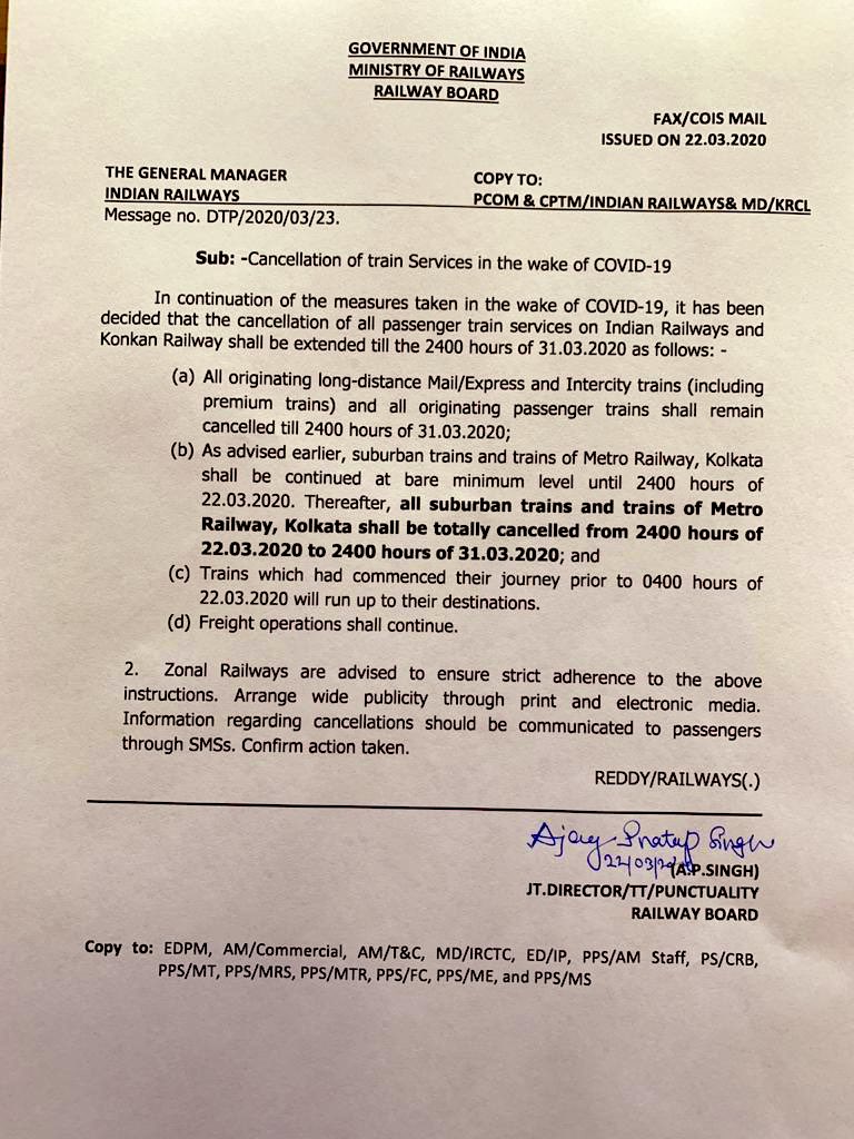 A bare minimum of suburban rail services and metro rail in Kolkata will continue till midnight tonight. The Union Railways Ministry has directed all Zonal Railways to ensure that the guidelines issued are strictly followed. It has also instructed that passengers are informed of the decision through SMSes and have sought confirmation of the implementation of the orders.