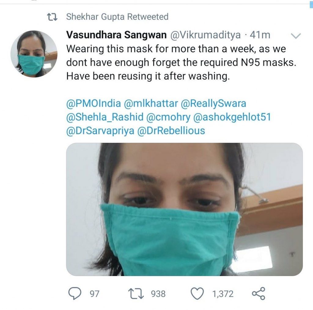 A Twitter handle named ‘Vikrumaditya’ who identifies himself/herself as Vasundhara Sangwan tweeted an image of a woman wearing a mask. Twitter user Vikrumaditya alias Vasundhara claimed that he/she (in the picture) is wearing the same mask since a week as doctors don’t have enough N95 masks, the masks which are more efficient in preventing the spread of the Wuhan Coronavirus. Please note that Vikrumaditya alias Vasundhara is not wearing an N95 mask in the above image.