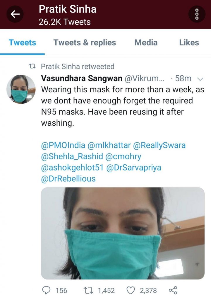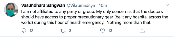 “My only concern is that the doctors should have access to proper precautionary gear,” Vikrumaditya alias Vasundhara tweeted. Not only that, the mask the person is wearing is an autoclaved one which is reused only. It is not disposable. However, soon after, he/she deleted this tweet as well. Now, the person has no more tweets on the timeline and he/she has also removed the profile picture and deleted the only two tweets from his profile.