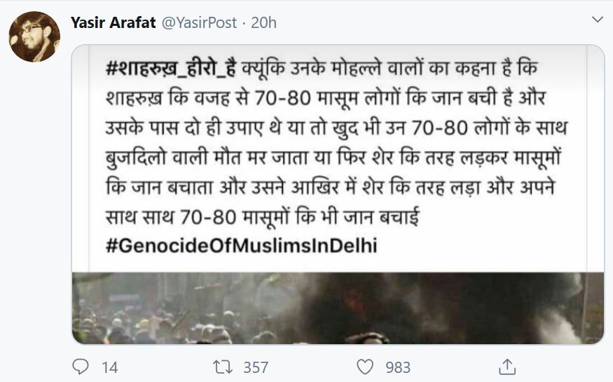 Yasir Arafat in one of his previous tweet had hailed Delhi anti-Hindu riot shooter Mohammad Shahrukh by calling him a ‘hero’.