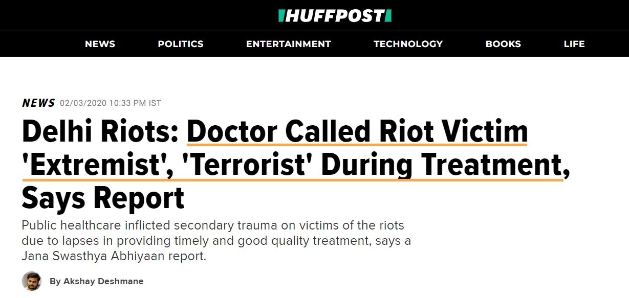 The Huffington Post is now caught peddling false propaganda against the doctors of the reputed Guru Teg Bahadur Hospital and Lok Nayak Jai Prakash Narayan hospital in Delhi claiming that the doctors of the hospital discriminated the victims of riots during the treatment.