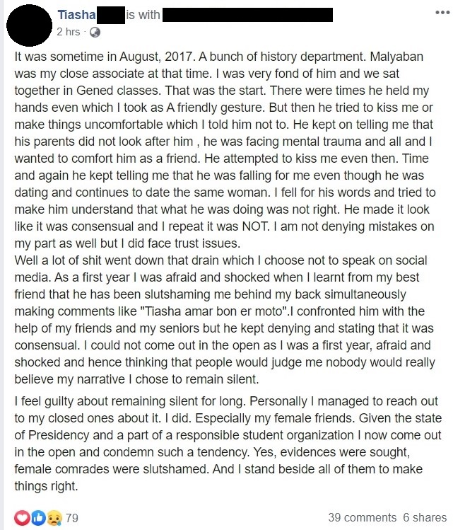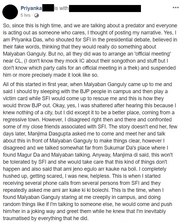 The student said that she was mortified by the suggestion and said that she was ‘shattered’. She then confronted some of her close friends associated with the SFI. She continued, “The story doesn’t end her (sic), few days later, Manjima Dasgupta asked me to come and meet her and talk about this in front of Malyaban Ganguly to make things clear, however I disagreed and we talked somewhat far from Sukumar Da’s place where I found Magur Da and Malyaban talking. Anyway, Manjima di said, this won’t be tolerated by SFI and she would take care that this kind of things don’t happen (sic) and also said that ami jeno egulo arr kauke na boil (I don’t tell anyone else about this).”