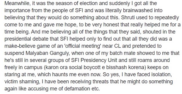 Subsequently, the student received calls from several members associated with the SFI and asked whether she had told anyone about the entire matter. She continued, “This is the time, when I found Malyaban Ganguly staring at me creepily in campus, and doing random things like if I’m talking to someone else, he would come and push him/her in a joking way and greet them while he knew that I’m inevitably traumatised by everything that he did.” Furthermore, she revealed a charade was orchestrated to give the pretense that Malyaban Ganguly had been suspended only for her to later find out that the entire matter was a farce.