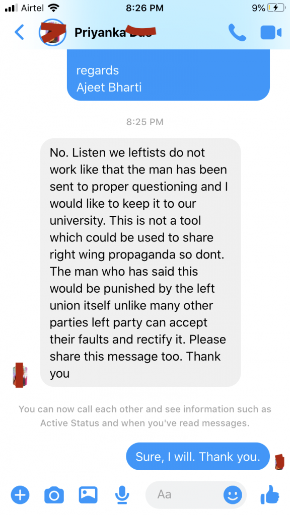 OpIndia reached out to the lady for her comments on the allegations she has put across, she told us that the grave allegations she put against SFI are not “tool which could be used to share right wing propaganda”.