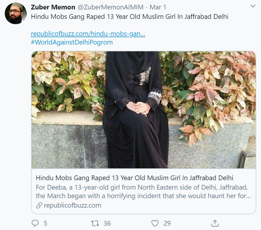 But these claims made by ‘Republic of Buzz’ is completely false and baseless. No Muslim girl was raped by Hindu mobs in Delhi’s Jafrabad.