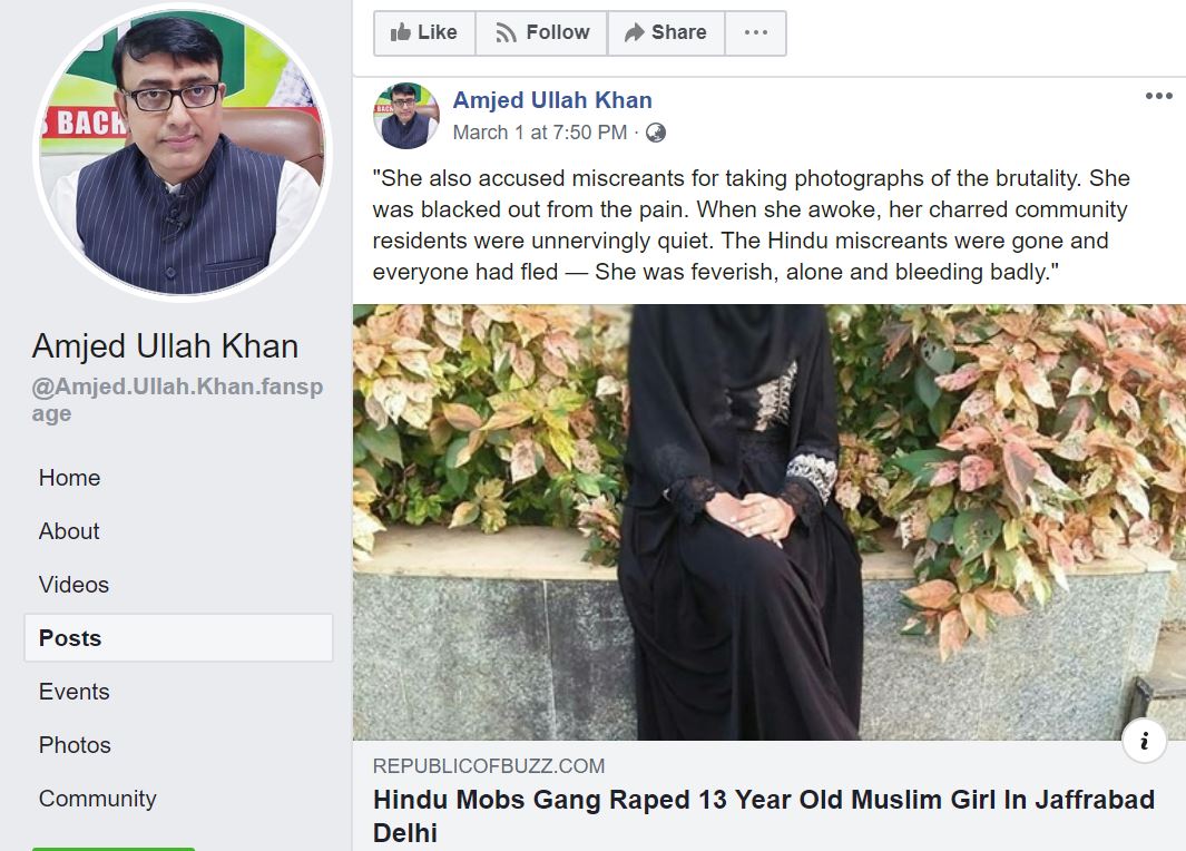 The article was titled: ‘Hindu Mobs Gang Raped 13 Year Old Muslim Girl In Jaffrabad Delhi’.