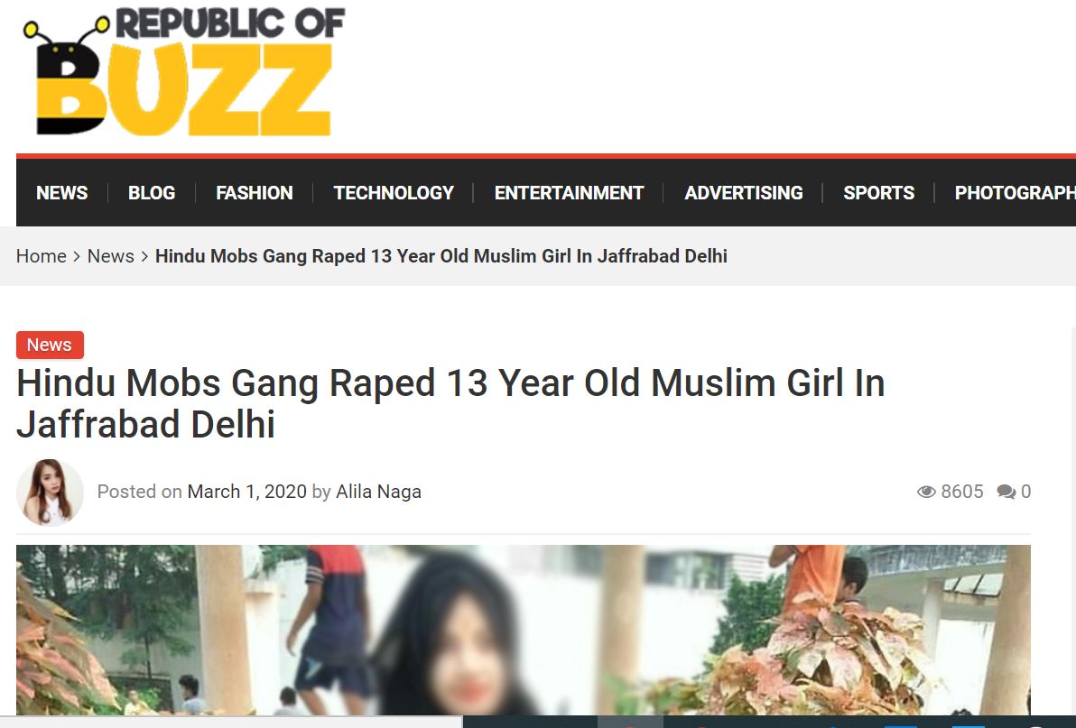 A Pakistani propaganda website ‘Republic of Buzz’ published an article on March 1, 2020, claiming that a Muslim teenage girl named Deeba from Jafrabad area of North-East Delhi was raped by Hindu mobs during the recent anti-Hindu riots in the national capital. This news was widely shared on social media.