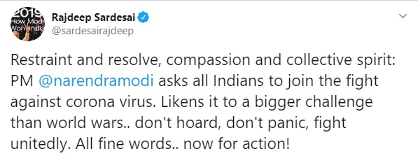 Rajdeep Sardesai, the Michealangelo of Indian journalism and a known member of the Congress ecosystem, supported PM Modi’s call for restraint and resolve during the testing times and asked the government to act now to tackle the health crisis.