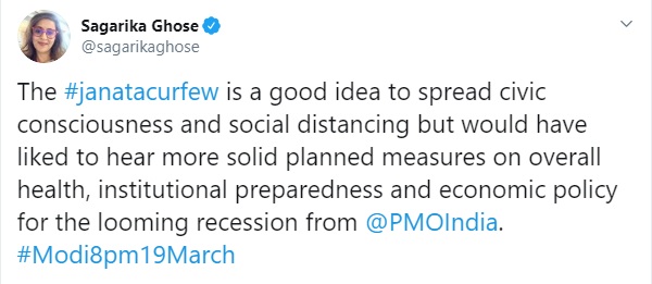 Sagarika Ghose, a self-styled ‘journalist’ and a known Modi baiter, surprisingly praised Prime Minister Modi for calling on citizens to observe social distancing through self-imposed curfew. However, as usual, there was also a bit of criticism from ‘intellectual’ Sagarika Ghose, as she said she would have liked to hear more about ‘solid measures’ on the overall approach to tackling the crisis.