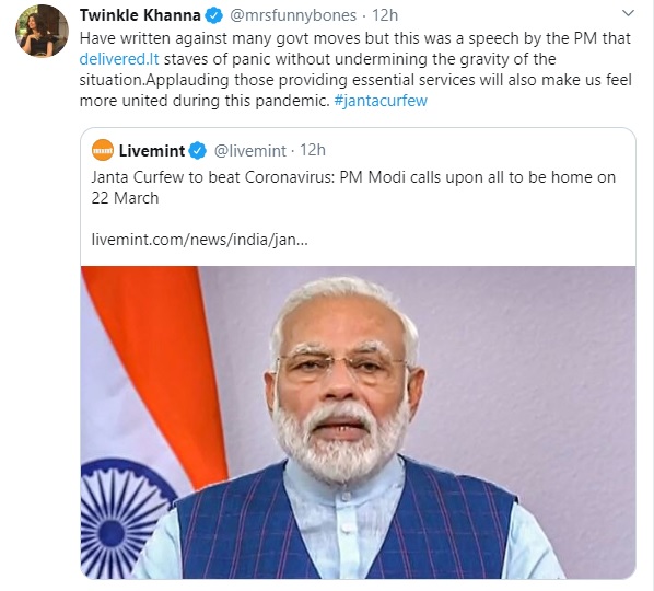 Former Bollywood actress Twinkle Khanna also surprised netizens and applauded PM Modi for his speech. Khanna who usually rants against the Modi government took to Twitter to state that PM Modi’s address to the fight the corona epidemic made her feel more united.