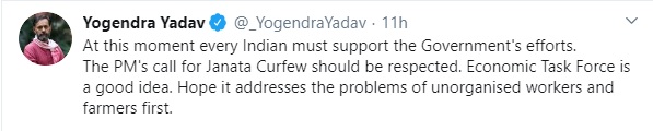Yogendra Yadav, a multi-talented ‘intellectual’ and self-proclaimed psephologist, also declared that every Indian must support the government’s efforts to fight the Chinese virus. Yadav, who often comes up with deranged assertions to attack the Modi government also supported the idea of the Economic Task Force.