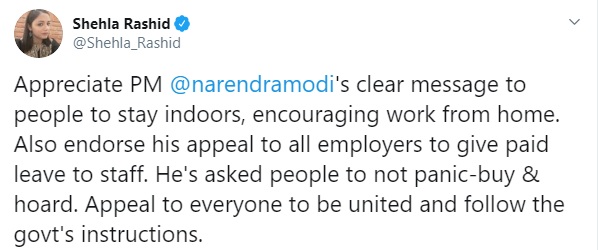 The most unexpected support to PM Modi’ initiative came from none other than Shehla Rashid. Rashid, who is a freelance protestor and a member of the anti-India JNU brigade, shocked the netizens when she appreciated PM Modi’s call to stay indoors. She also endorsed PM Modi’s appeal, asked everyone to be united and follow the instructions given by the government.