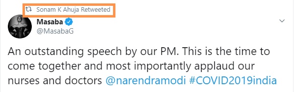 Sonam K Ahuja, another Bollywood starlet, also retweeted a post praising PM Modi’s efforts. Sonam Kapoor retweeted Masaba Gupta’s post which said that PM Modi delivered an outstanding speech and it was the time to come together to applaud our nurses and doctor.