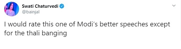 Abusive troll Swati Chaturvedi too called PM Modi’s Thursday speech as a ‘better one out of all his speeches’. Chaturvedi however, was not happy with PM Modi’s appeal to applaud the thousands of people who are working day and night to fight the coronavirus outbreak.