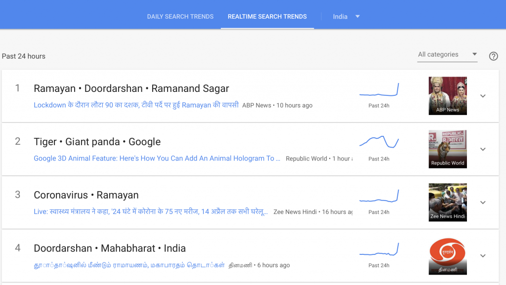 Not only did Ramayan on Doordarshan become the top search on Google, the Doordarshan website where one could watch the channel live online crashed due to high traffiic.