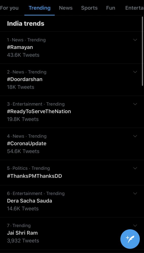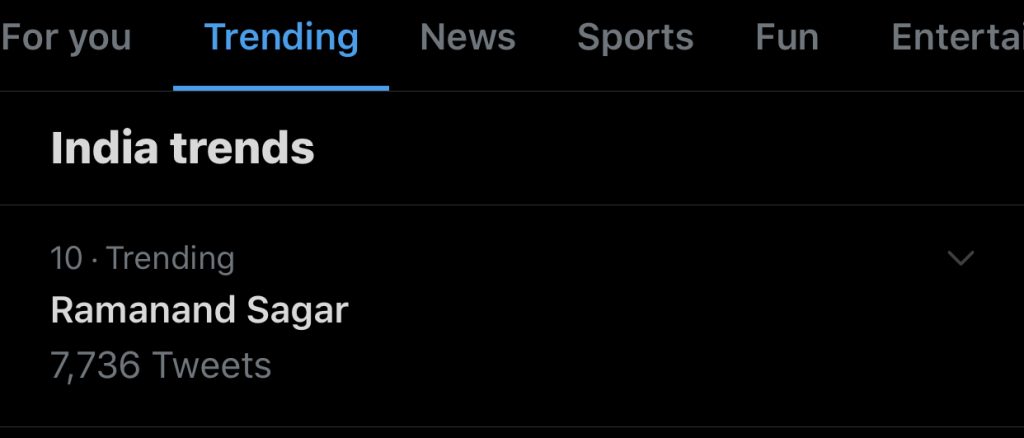 Even on Social networking site Twitter, four trends in the top 10 trends pertained to Ramayan, Ramanand Sagar, Lord Ram and Doordarshan.