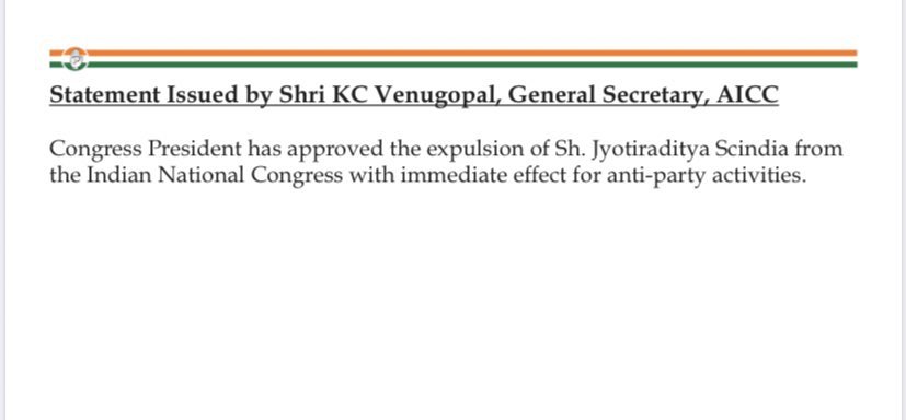 A day after he resigned, the Congress party has approved ‘expulsion‘ of Scindia with immediate effect.