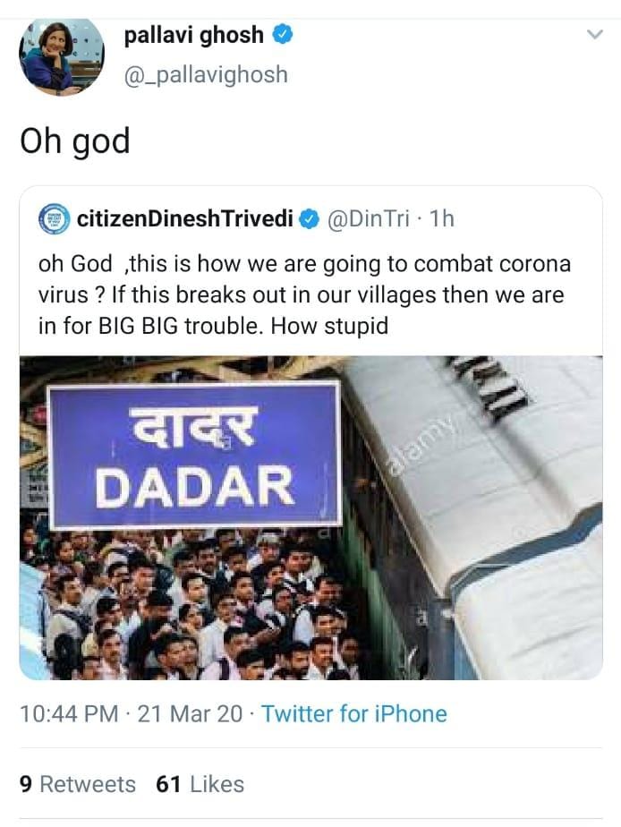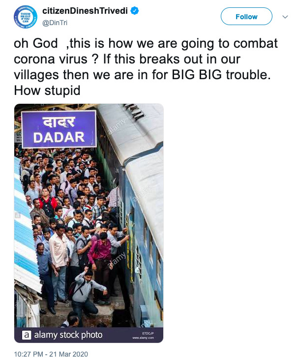 Dinesh Trivedi tweeted, “oh God ,this is how we are going to combat corona virus ? If this breaks out in our villages then we are in for BIG BIG trouble. How stupid (sic)”