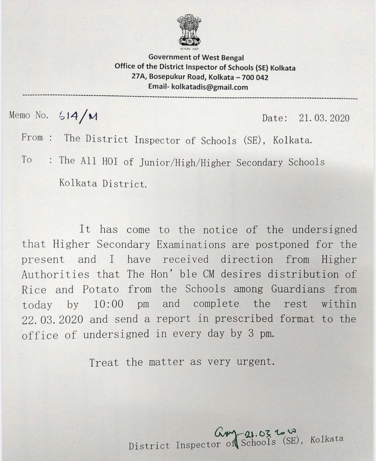 Swapan Dasgupta, a Member of the Rajya Sabha, said, “The exercise, which could have been done Monday is aimed at subverting social distancing. This is vindictive politics.” The order he shared on Twitter, issued on the 21st of March, reads, “It has come to the notice of the undersigned (District Inspector of Schools, SE, Kolkata) that Higher Secondary Examinations are postponed for the present and I have received directions from Higher Authorities that The Hon’ble CM desires distribution of rice and potato from the Schools among Guardians from today by 10:00 pm and complete the rest within 22.03.2020 and send a report in prescribed format to the office of undersigned in every day by 3 pm.” The order also instructed all the HOI of Junior/High/Higher Secondary schools of Kolkata district to treat the matter as “very urgent”.