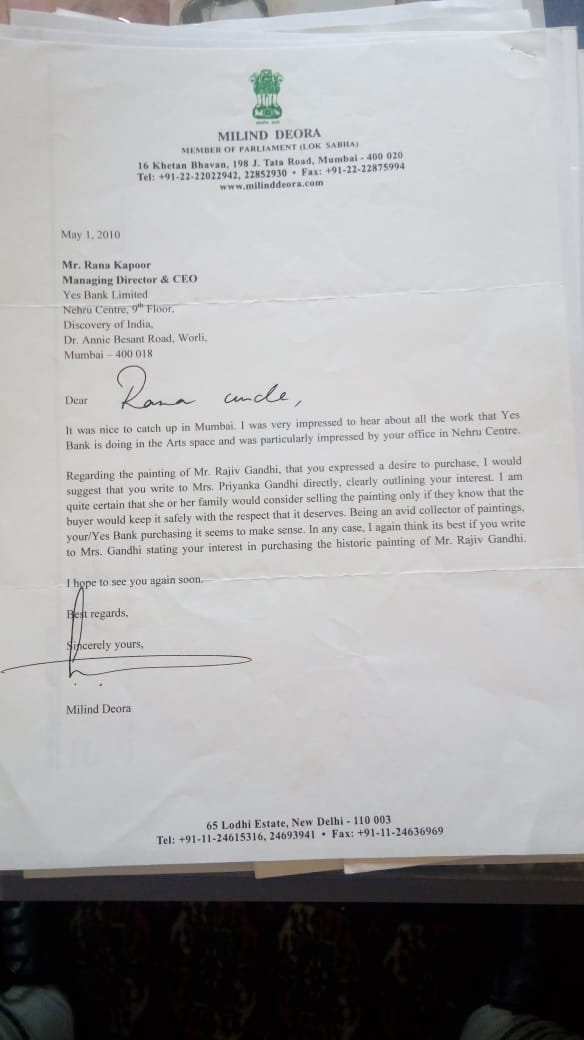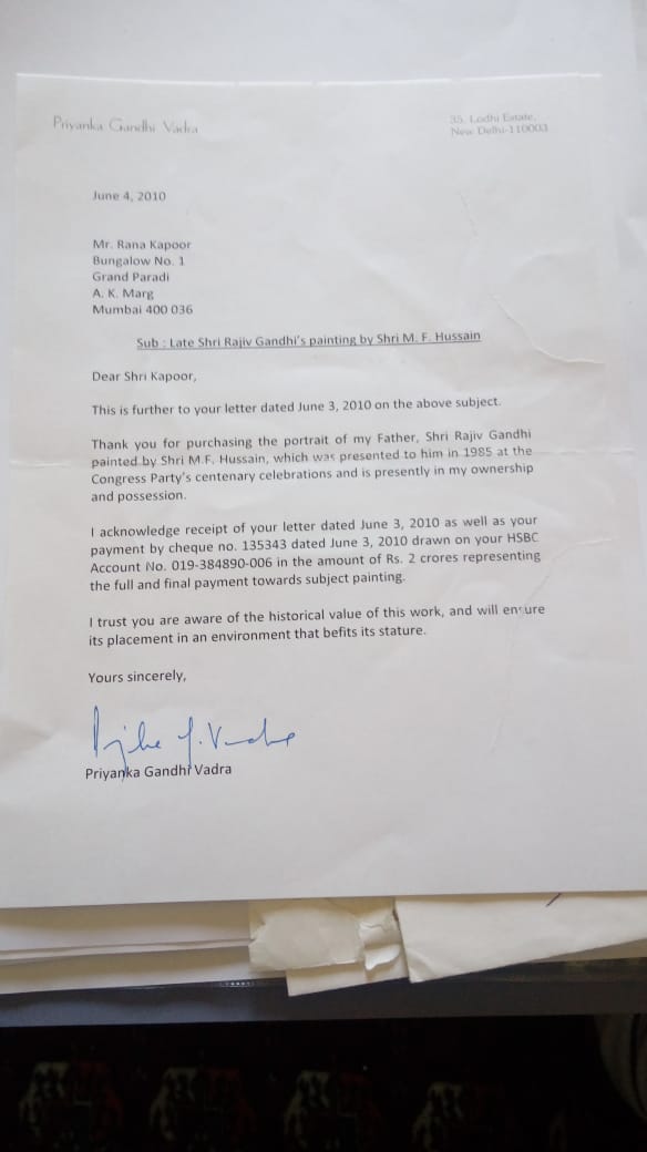 On 4th June 2010, Priyanka Gandhi Vadra wrote a letter to Rana Kapoor, at Bungalow No 1, Grand Paradi address in Mumbai. (Note, it is home address from 2010, not addressed to Yes Bank CEO) wherein she mentions she is selling the M F Hussain painting of her father gifted to him by the painter in 1985 on the centenary celebrations of the Congress.