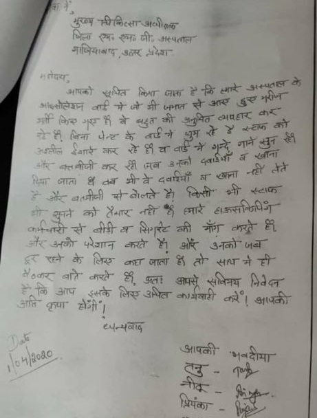 The Chief Medical Officer of the District MMG Hospital in Ghaziabad said the same in a letter to the Ghaziabad Police. The letter also states that obscene comments and songs were being heard from the ward, and inmates were asking for beedi-cigarettes from the staff of the hospital. The letter by CMO states that the staff nurses of the hospital had already written a letter to the police regarding the matter, and requested the police to take necessary action so that the Jamaatis could be disciplined.