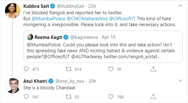 Atul Khatri took to Twitter to abuse Rangoli Chandel for her alleged comments against Muslim clerics. Khatri, who seems to have got upset at Rangoli following her comments against Muslim clerics, responded to one actress called Kubbra Sait to hurl casteist slurs against Rangoli Chandel. Kubbra was demanding that Mumbai Police and the CM of Maharashtra take “necessary action” against Rangoli Chandel.