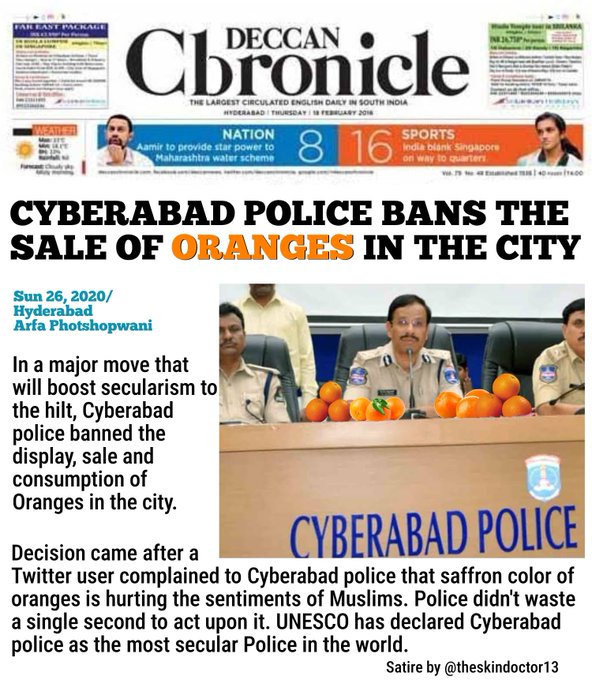 Major Neelum Singh (rtd), who runs the popular Twitter handle @skindoctor had used the photoshopped front page of Hyderabad-based English daily Deccan Chronicle and had created a spoof report that said the Cyberabad police has banned the sale of oranges in the city to ‘boost secularism’. The image had clearly mentioned that it is a satire. Many twitter users had shared the image, including BJP leader Major Surendra Poonia, who later deleted it.