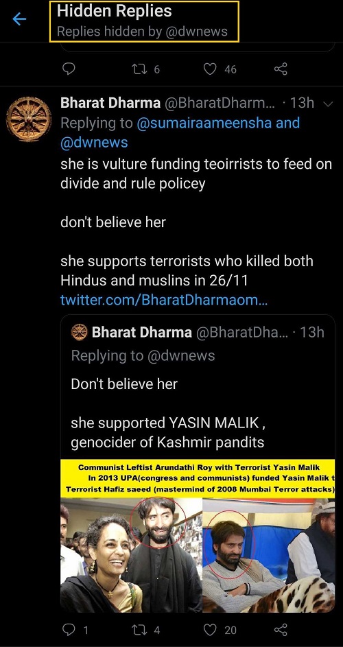 Bharat Dharma, another social media user’s tweets were also hidden by DW News after he called Arundhati Roy as a vulture as she shared images of Arundhati Roy sharing stage with Kashmiri terrorist Yasin Malik.