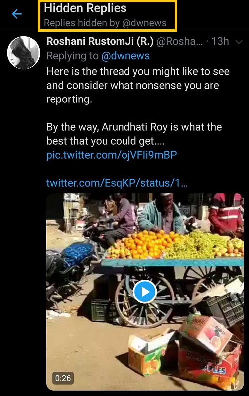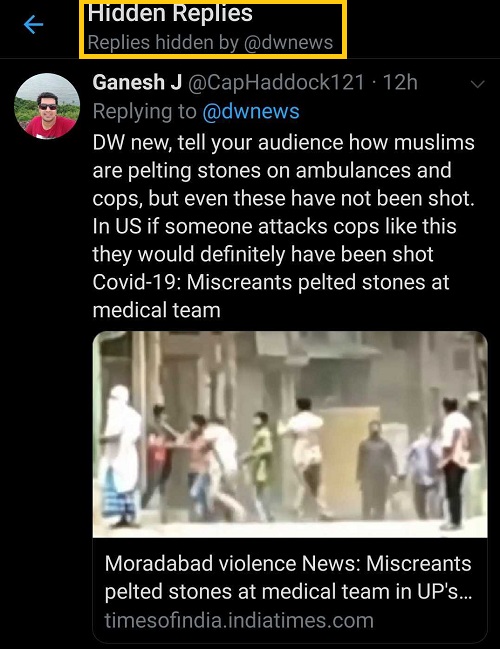 A social media user named Ganesh J responded to Arundhati Roy’s rants by giving her evidence on how Muslim were pelting stones on ambulances and police to refute allegations that Muslims are being targetted in the country. However, Ganesh’s tweets were hidden from other social media users by DW News to further lies of Arundhati Roy.