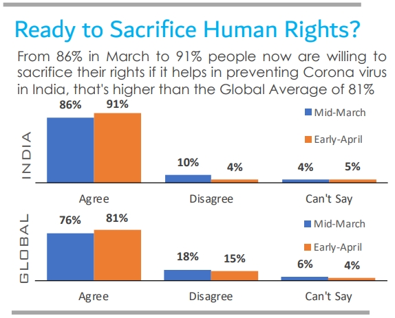 A whoping 91 per cent of the Indians have answered that they would be willing to sacrifice their human rights if it helped to fight the coronavirus in their countries. In the March poll, 86% Indians had said that they are ready to sacrifice their rights. This means the number of people willing to curtail their rights in a larger interest has gone up in one month.