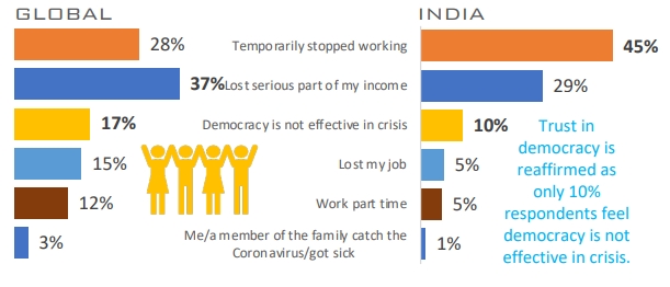 Despite the temporary setback, most people have faith in democracy, as only 10% in India said that Democracy is not effective in crisis, while globally 17% people thing democracy is not effective.