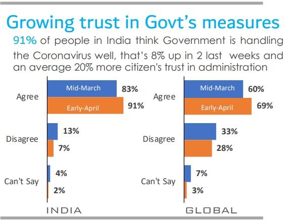 This was the second round of polls conducted by the agency to gauge people’s reaction to the efforts of their governments in combating Coronavirus. In the earlier poll conducted in Mid March, 83% India had said that the think Government is handling the Coronavirus crisis well, which means the number of people has gone up by 8% in a month.