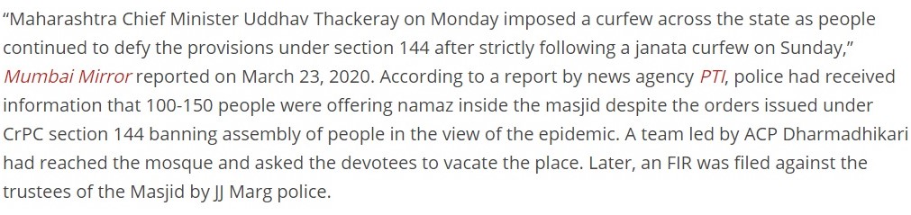 The ‘fact check’ shared by AltNews co-founder Zubair says that the video was recorded outside a Mosque in Maharashtra, the worst affected state by the pandemic. As per the AltNews report itself, Mumbai Mirror had reported on the 23rd of March that “Maharashtra Chief Minister Uddhav Thackeray on Monday imposed a curfew across the state as people continued to defy the provisions under section 144 after strictly following a janata curfew on Sunday.” Furthermore, again by the admission of AltNews itself, PTI had reported that the “Police on Monday registered an FIR against the trustees of a masjid where up to 150 people were found offering namaz in violation of government orders issued to check the spread of the coronavirus.” Thus, quite clearly, those who had gathered at the Mosque were defying the orders issued to curb the spread of the pandemic.