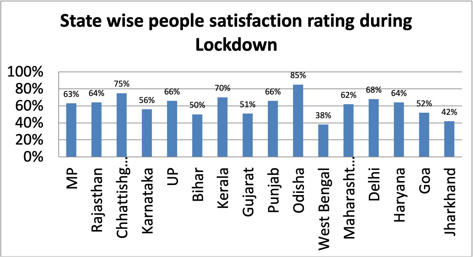Odisha trumps all other states on the question about the satisfaction over the state-implemented measures during the lockdown. An astounding 85 per cent of the survey respondents from Odisha have claimed that they are highly satisfied with lockdown put into effect in their state. The lowest confidence among the respondents is from the state of West Bengal where only 38 per cent of the total surveyees have expressed their content with the government measures. It is pertinent to note that Odisha has been under a strict lockdown since PM Modi’s announcement of 21-day lockdown. On the other hand, West Bengal, whose TMC government has often been at loggerheads with the centre, had been lax in enforcing the lockdown in the state.
