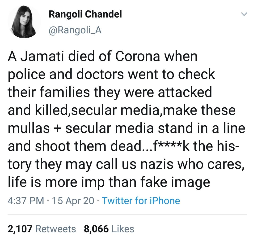 On 15th April, Chandel had tweeted that after one Jamaati had died of coronavirus, the family members attaked the police and doctors who had gone to check with their families. Angered by the treatment meted out to healthcare workers and police, Chandel said that these ‘Mullahs’ and ‘secular media’ should be made to stand in line and shot dead. However, soon after her tweet, she was accused of ‘giving an open call for genocide’.