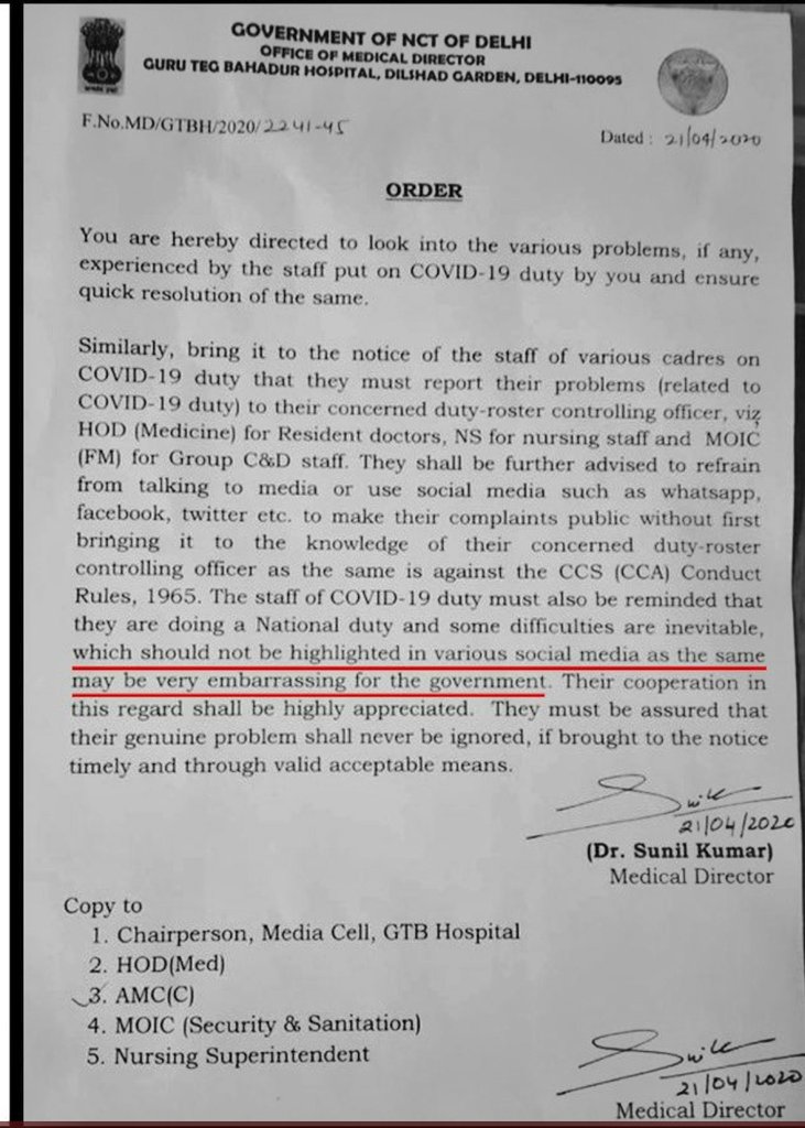 In an order dated April 21, GTB Hospital, Delhi, has warned and disciplined medical personnel who went on social media with workplace concerns about coronavirus related problems. The Guru Teg Bahadur (GTB) hospital is a Delhi government tertiary care hospital in East Delhi.