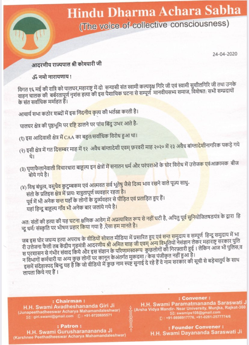 Condemning the incident without mincing words, the letter sought an answer from the Maharashtra government. It said that after the video of the lynching went viral on social media and drew sharp condemnation from Hindu’s, Home Minister Amit Shah intervened and asked the state government to take action. Buckling under pressure, the state government led by CM Uddhav Thackeray did make arrests, but the actual culprits behind the murder have not been arrested by the police. The police laxity in handling the case and the discrepancies between the complaint and the video evidence has been questioned. The Hindu Dharma Achara Sabha asks the Maharashtra governor as to why no action has been taken against the police officials who have shown laxity and created loopholes for the real culprits to escape the clutches of law.