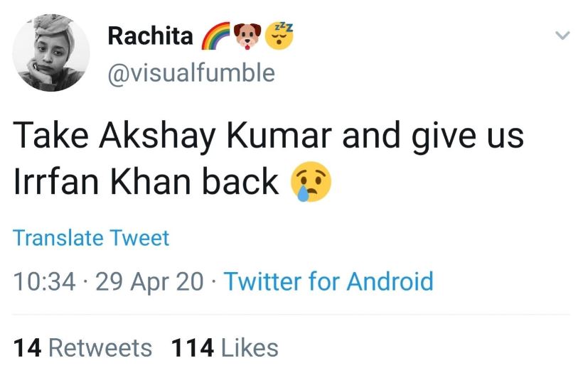 Comic artist Rachita Taneja, the founder of webcomic Sanitary Panels, took to Twitter today to wish for the death of Bollywood superstar Akshay Kumar while mourning actor Irrfan Khan’s demise. In her tweet, Taneja wrote: “Take back Akshay Kumar and give us Irrfan Khan back”.