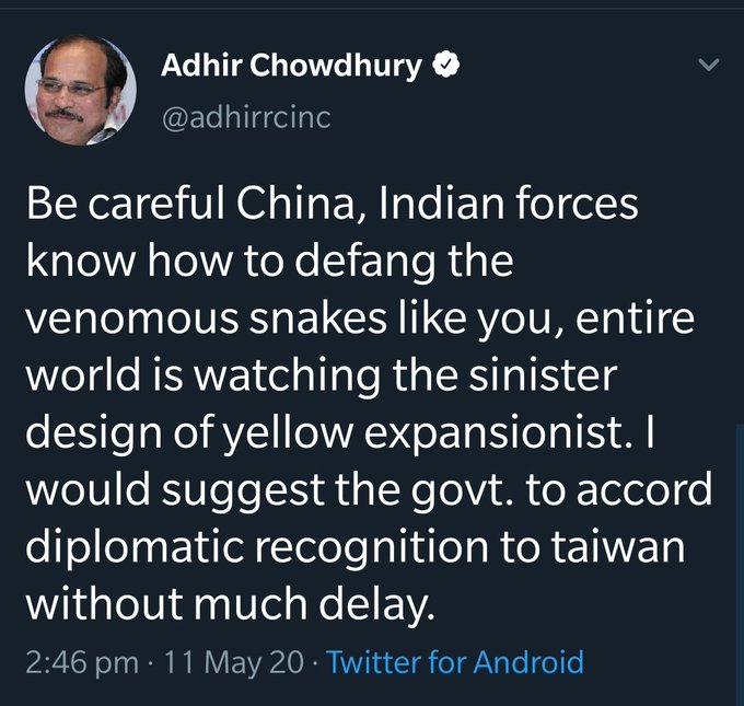 However, Adhir Ranjan Chowdhury’s bluster against China did not last long. He soon deleted his tweet, leaving twitter users to wonder what might have been the reason. The racial slur also received wide criticism by many.