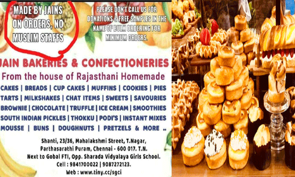 On Sunday, the Chennai police arrested an owner of a pure vegetarian Bakery after he had put out an advertisement stating that it employed no Muslims to prepare food items. The owner of Jain Bakeries and Confectioneries in Chennai’s T Nagar had put out a cautionary message on WhatsApp pointing out that all their orders are “made by Jains” and no Muslim staff were engaged for the purpose.