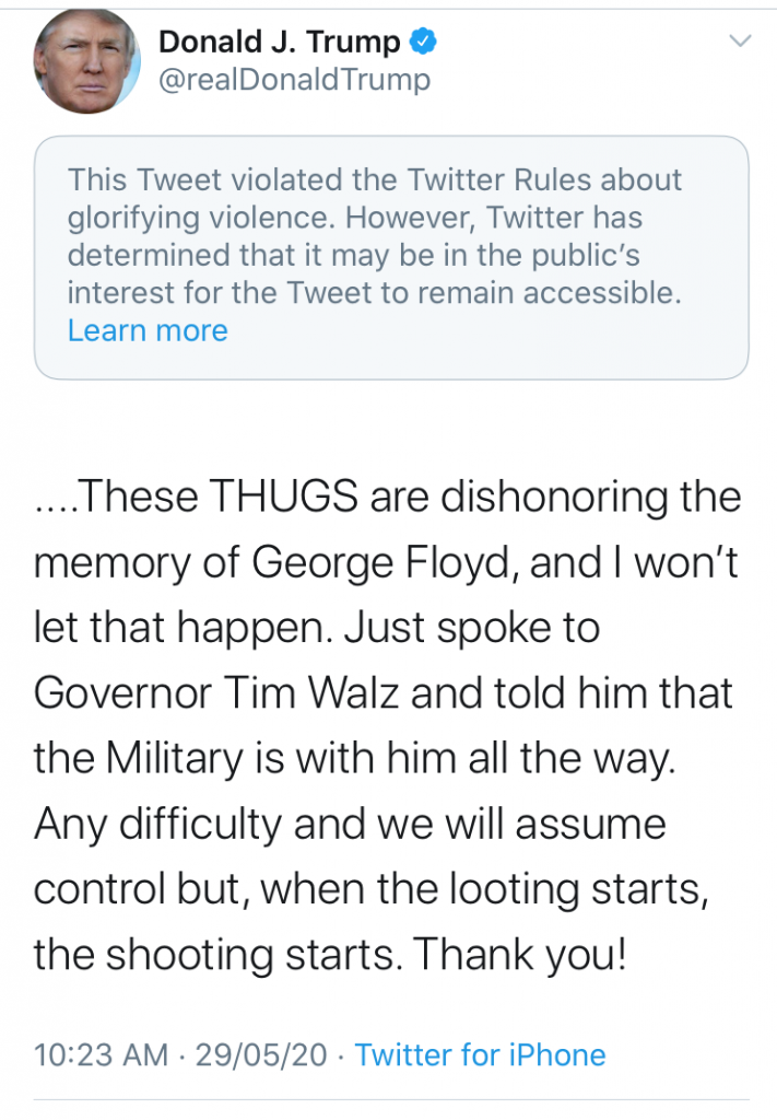 Trump's tweet saying "when the looting starts the shooting starts" is glorifying violence
