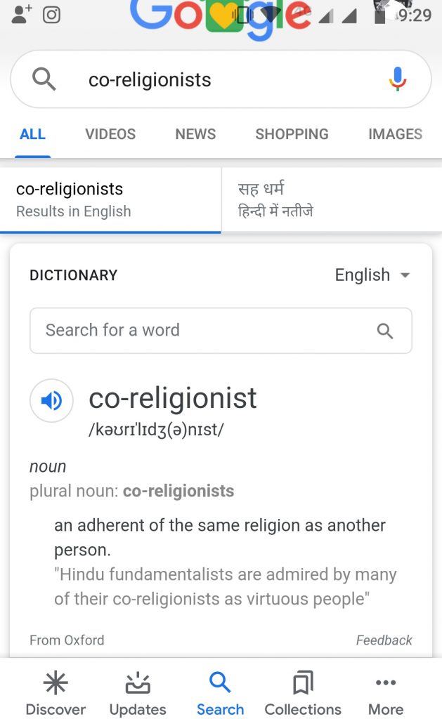 After the widespread protest, however, Google seems to have taken cognisance of the blatant Hinduphobia and removed that sentence as an explanation for the definition of co-religionist from Google search in most countries. Currently, while Google is still drawing its definition from Lexicon by Oxford, the sentence does not appear in the ‘Dictionary’ feature. But this appear when one searches for the phrase in the USA. This means that while Google has removed the offending sentence for searches for rest of the world, it is yet to that for USA, where it is based.
