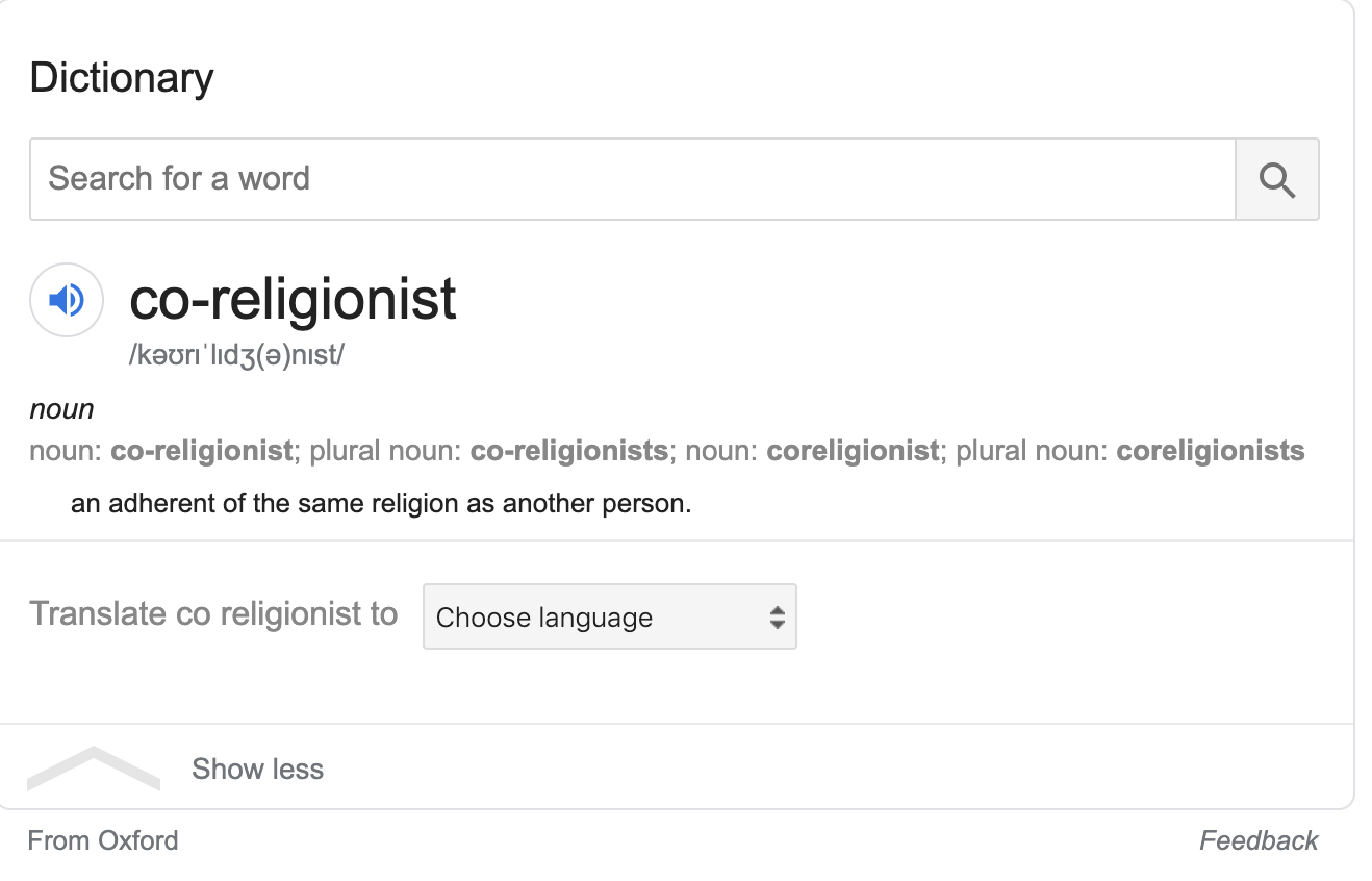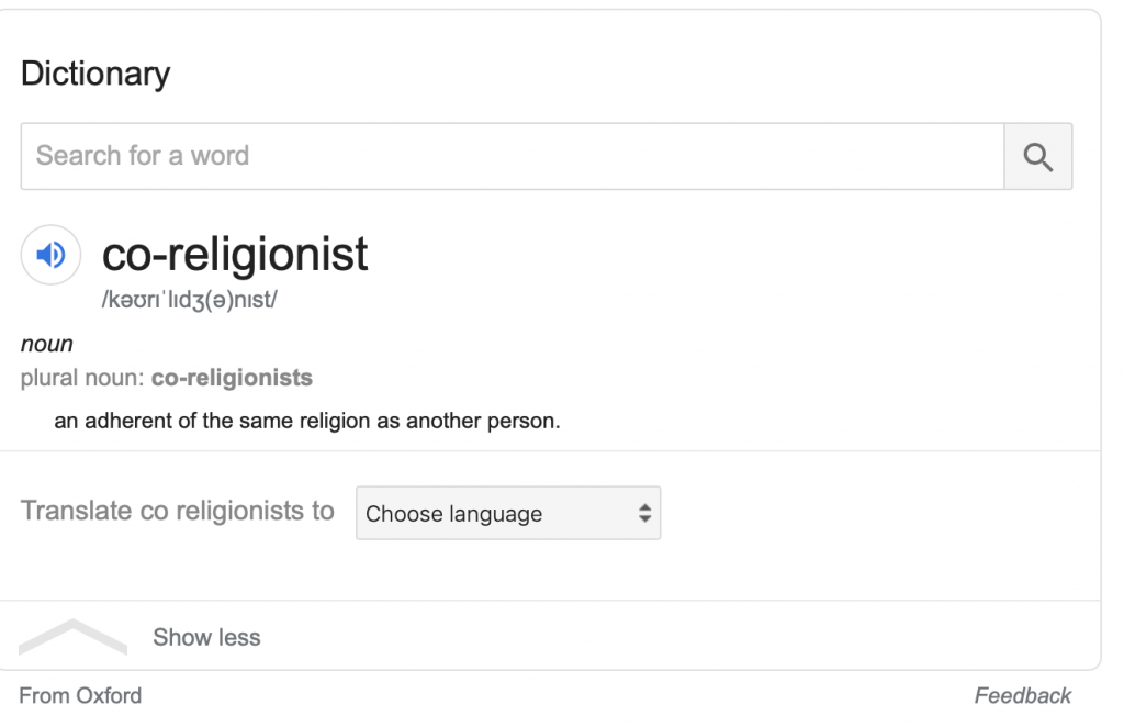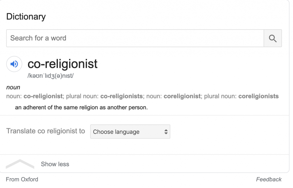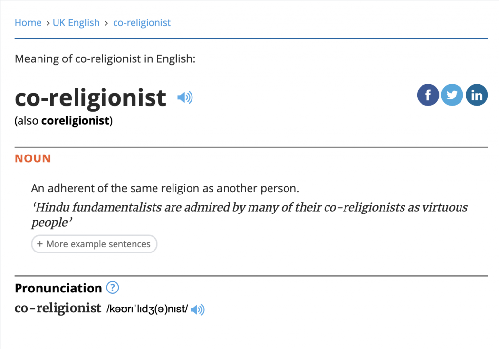 The ‘Dictionary’ feature of Google throws up definitions of words that one wishes to understand and searches for. When one searched for the term ‘co-religionist’, while the definition says, “an adherent of the same religion as another person”, the sentence that accompanies the definition to put the word in reference to context was deeply problematic and Hinduphobic. Up until yesterday, explaining the reference to context, Google defined ‘co-religionist’ with the sentence, “Hindu fundamentalists are admired by many of their co-religionists as virtuous people”.
