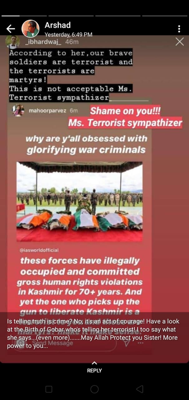 “Why are you all obsessed with glorifying war criminals? These forces have illegally occupied and committed gross human rights violations in Kashmir for 70+ years. And yet the one who picks up the gun to liberate Kashmir is a terrorist to you and these are martyrs? Make it make sense,” she said.