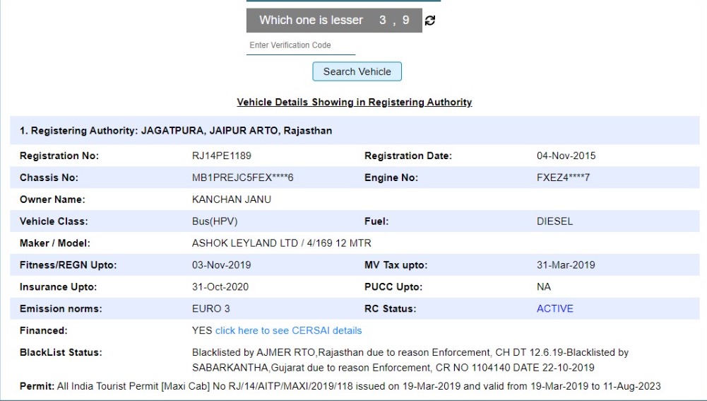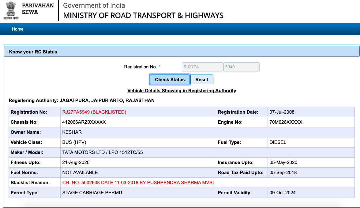 One bus with Registration number RJ27 PA 5949 which as per the list sent by Priyanka Gandhi is driven by one lady Smt. Keshar Devi. However, it is blacklisted.