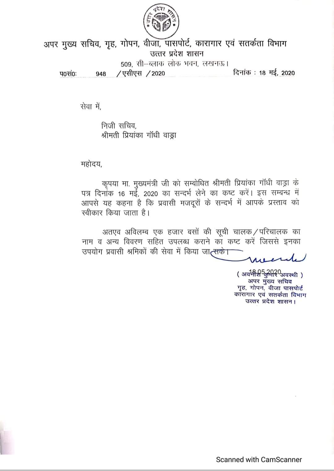 In a letter to Priyanka Gandhi Vadra, UP Additional Chief Secretary (Home) Awanish Awasthi informed her that the government has accepted her proposal dated 16th May for providing buses for migrant workers. “Hence, without any delay please send list of drivers and co-drivers of these 1,000 buses so that we can make use of them in bringing back the migrant workers,” he wrote.