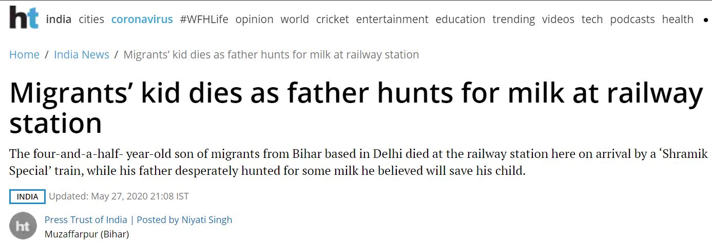 Hindustan Times had published an article dated May 27, 2020, titled: “Migrants’ kid dies as father hunts for milk at railway station”, claiming that a four-and-a-half-year-old son of migrants from Bihar based in Delhi died of hunger at the railway station on arrival by a ‘Shramik Special’ train.