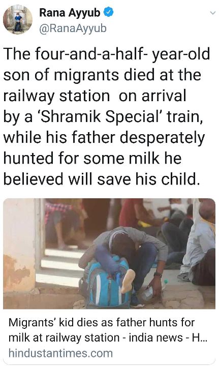 This report was shared by journalist Rana Ayyub. She immediately took to Twitter to further the lie by sharing the report captioning her Tweet: “The four-and-a-half-year-old son of migrants died at the railway station on arrival by a ‘Shramik Special’ train, while his father desperately hunted for some milk he believed will save his child”, insinuating that the lack of adequate arrangement of basic facilities like food and water on board and on platforms led to the death of the infant.