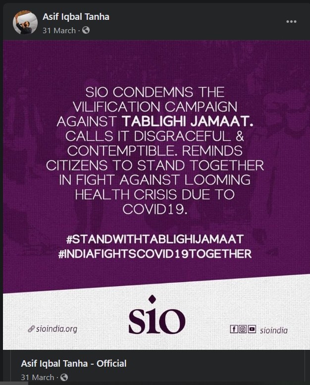 Asif Tanha’s links to the SIO becomes evident from his Facebook profile. According to his profile on Facebook, he is an ex-finance secretary of the SIO at JMI. He has made numerous posts where he has shared statements made by the Islamist organisation. He shared a post by SIO where the organisation condemned the ‘vilification’ campaign against the Tablighi Jamaat. It is pertinent to mention here that the Jamaat has emerged as the largest Coronavirus vector in the country and its members have harassed female healthcare staff sexually, spit on doctors, healthcare staff and policemen alike and made all efforts to avoid being quarantined.
