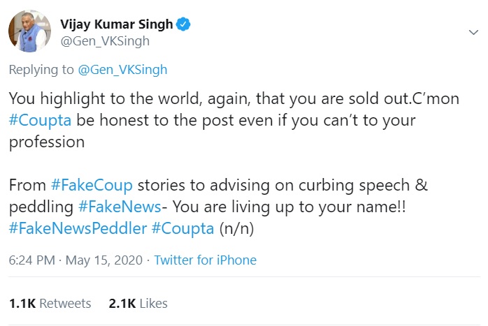 Referring to Shekhar Gupta, as a ‘sold out’ journalist, General VK Singh mocked the senior journalist of living up to him name by resorting to planting fake coup stories to advising curbing speech and peddling fake news.